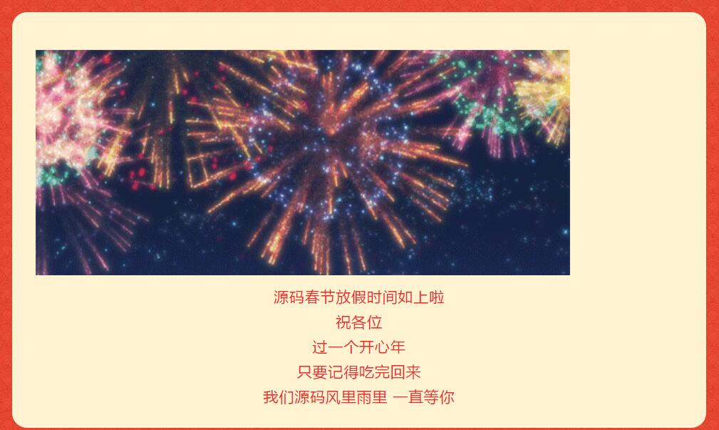 在2021年春節(jié)來臨之際,源碼祝愿廣大客戶:幸福安康,生意興隆,事業(yè)有成,牛氣沖天,根據(jù)《國務(wù)院辦公廳公布2021年春節(jié)放假安排》,結(jié)合公司實(shí)際情況與工作安排,春節(jié)放假安排如下: