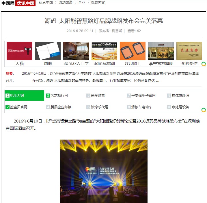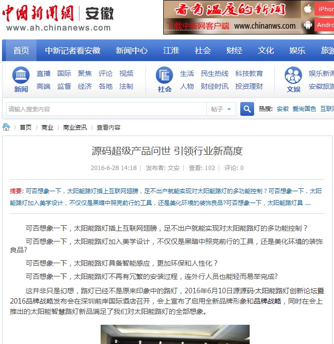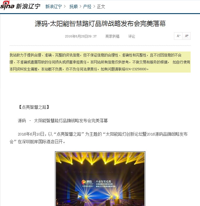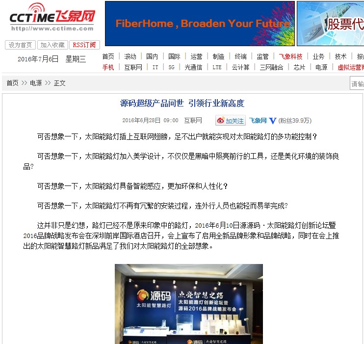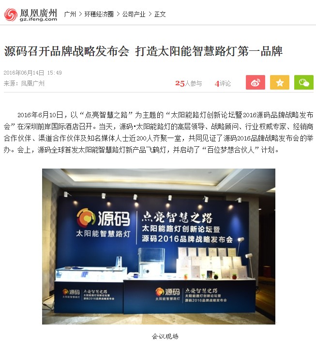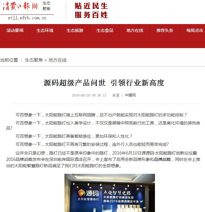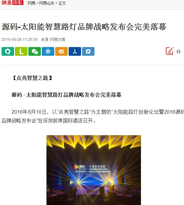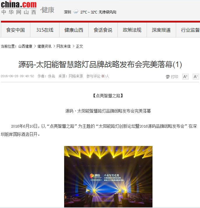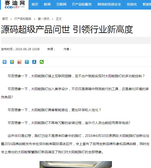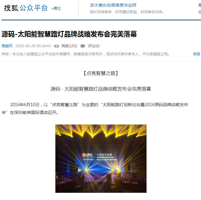 繼源碼在深圳成功舉行太陽能路燈創(chuàng)新論壇暨源碼2016品牌戰(zhàn)略發(fā)布會后,引起了各大媒體和行業(yè)的廣泛關(guān)注,行業(yè)專家柴鈺教授表示,此次源碼發(fā)布會已經(jīng)顛覆了行業(yè)對傳統(tǒng)太陽能路燈的認(rèn)知,對太陽能路燈行業(yè)的發(fā)展指明了方向。在各大媒體的爭相報(bào)道下,網(wǎng)上掀起一片關(guān)于“源碼”的信息狂潮。