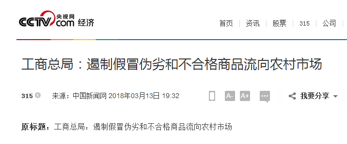 筆者發(fā)現(xiàn),國家工商總局近日在官網(wǎng)公布《關(guān)于開展2018年紅盾質(zhì)量維權(quán)行動的通知》。《通知》提出,突出工作重點全面強化監(jiān)管執(zhí)法。各地工商和市場監(jiān)管部門要圍繞當(dāng)前商品和服務(wù)質(zhì)量突出問題,著力加強商品和服務(wù)質(zhì)量監(jiān)督檢查力度。《通知》尤其提到了過往關(guān)注力度稍弱的農(nóng)村市場,要嚴(yán)厲打擊偽劣商品違法行為,遏制假冒偽劣和不合格商品流向農(nóng)村市場。