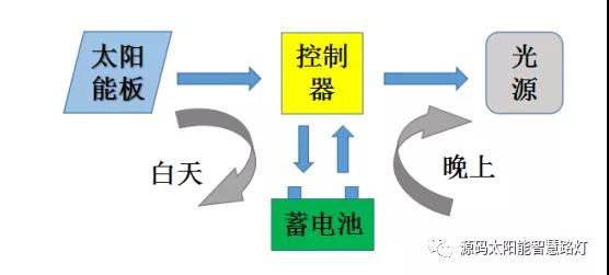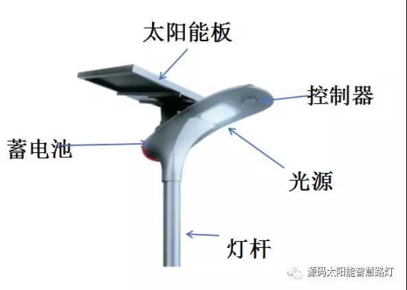 太陽能路燈的主要組成部分:太陽能板、蓄電池、控制器、光源、燈桿。
