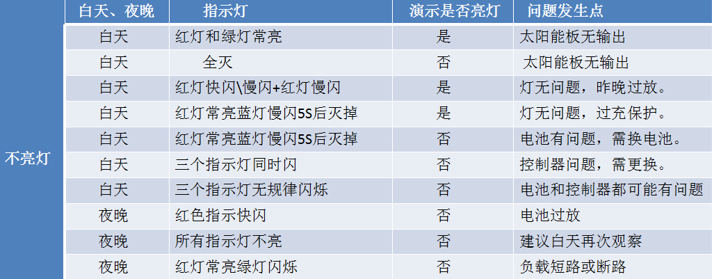 (1)如果出現(xiàn)不亮燈紅色指示燈快閃的數(shù)量非常多,陰雨天過多,已經超過燈具最大可承受的陰雨天數(shù)。