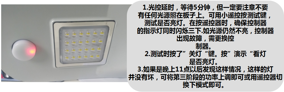 (2)待趕到現(xiàn)場后,先用小遙控按測試鍵是否亮燈?(請確保小遙控在有效距離三米內,并且指示燈同時閃爍三下)若果燈不亮,可判定燈工作出現(xiàn)異常。需要進一步進行排查。如果燈是亮的,并且指示燈正常閃爍在充電,外界的因素比較大,比如陰雨天遮擋等。